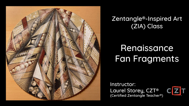 In this Zentangle-Inspired Art (ZIA) class (originally developed by Deb Bowyer, CZT as part of the CZT : AE 2020 Masterclass), students will build on their Zentangle practice, working with a variety of tangle patterns, fragments, and techniques to create a beautiful tan Zentangle Zendala (4-5/8″/117mm round) paper tile in a Renaissance colour palette.