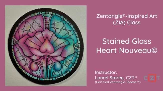 Note: The “Stained Glass Heart Nouveau©” concept was developed by Annie Reiser, CZT and originally presented to a group of Certified Zentangle Teachers® at an online “CZT Zoom Treff” workshop. The Stained Glass Heart Nouveau© class offered by Laurel Storey, CZT at in-person sessions in Windsor, Ontario is inspired by Annie’s original design and shared with permission.