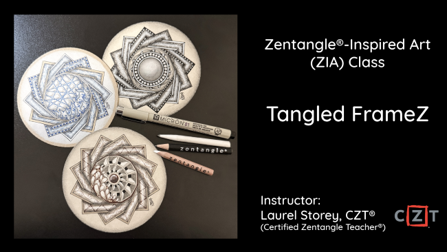 In this Zentangle-Inspired Art (ZIA) class, students will work on a grey or tan Zentangle Zendala (4-5/8″/117mm round) paper tile and create an intricate design of interlocking frames that will form the foundation of their finished work. Students will have the freedom to choose from a variety of colours and tangle pattern embellishments to adorn the frames and create a piece that is their own unique design.